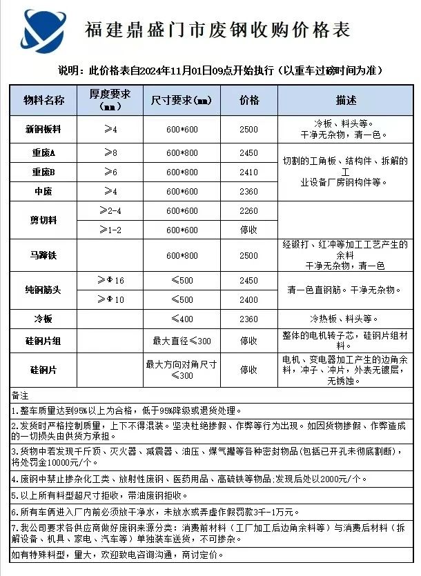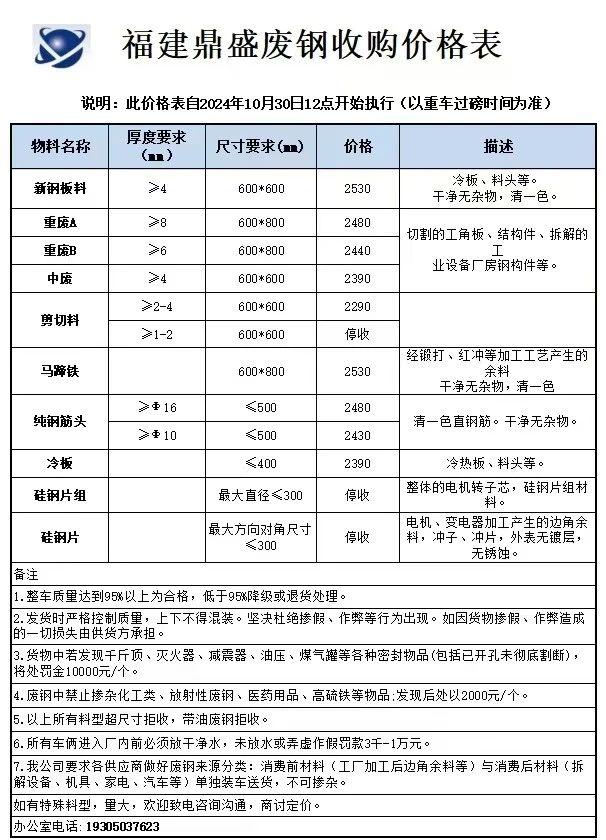 *日福建鼎盛跌**,新钢板料****,重A****,重B****,中废****,剪切料****,马蹄铁****,纯钢筋头****-****,冷板****,矽钢片组停收,矽钢片停收,不含税