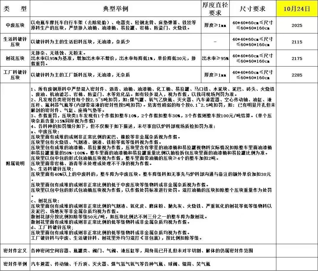 亿鑫****年**月**日废钢上调**元/吨,既炉料含税价****元/吨、精料含税价****元/吨、冲子料含税价****元/吨、钢筋压块含税价****元/吨、锻打料含税价****元/吨