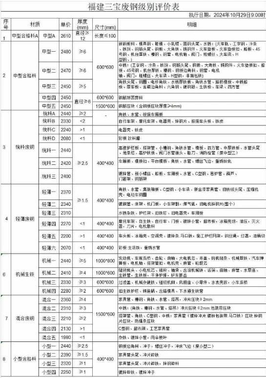 福建亿鑫:****年**月**日**:**废钢下调**元/吨,既炉料含税价****元/吨、精料含税价****元/吨、冲子料含税价****元/吨、钢筋压块含税价****元/吨、锻打料含税价****元/吨。