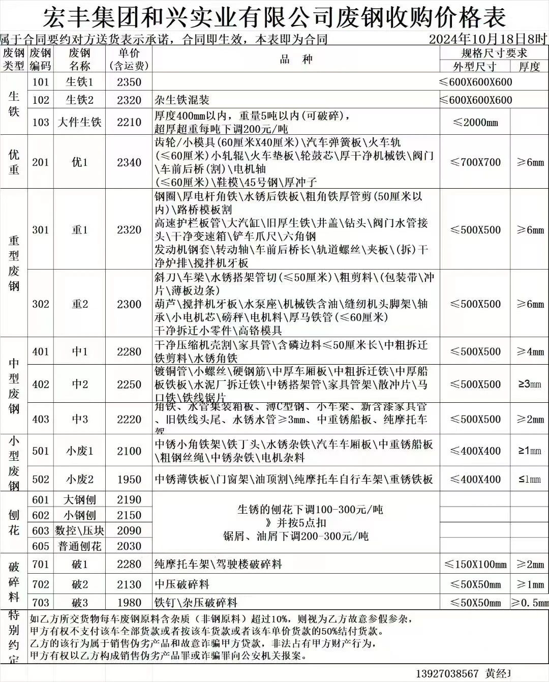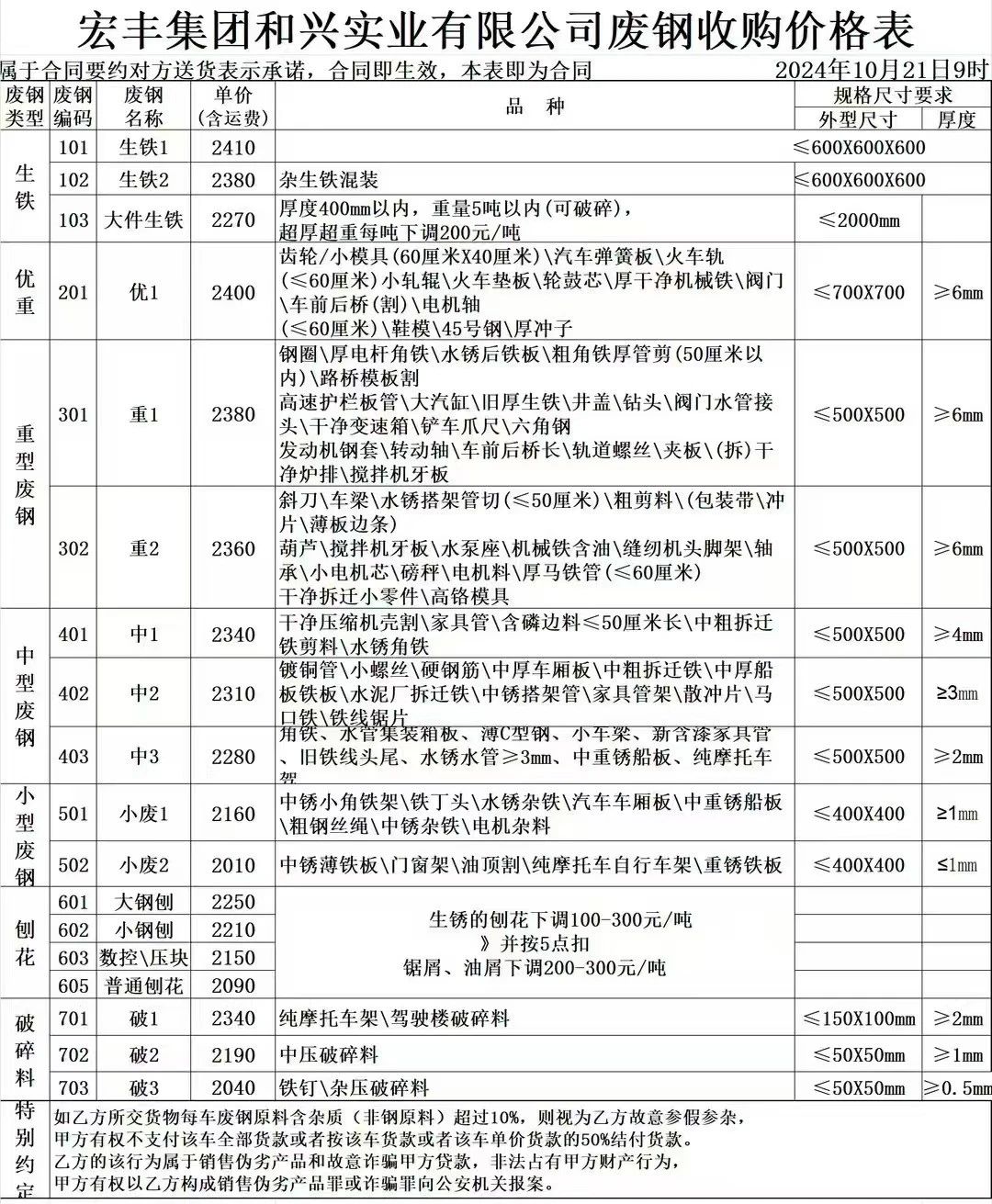 顺昌宏丰通知:废钢刨花破碎料等所有品种统一下调**元/吨,现在起执行,生铁****-****、大件生铁****、优重****、重废****-****、中废****-****、小废****-****、大钢刨****、数控/压块****、普刨****、破碎料****-****
