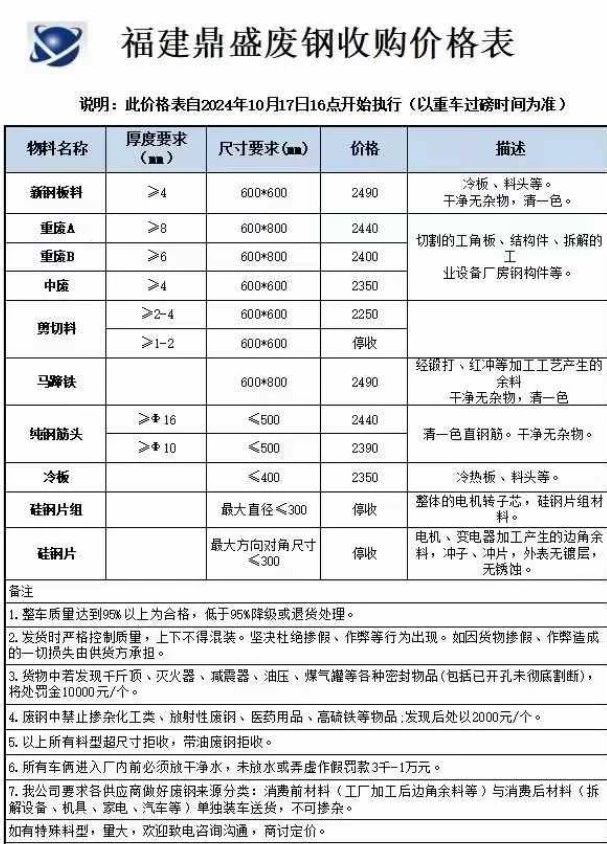 **日福建鼎盛涨**,新钢板料****,重A****,重B****,中废****,剪切料****,马蹄铁****,纯钢筋头****-****,冷板****,矽钢片组停收,矽钢片停收,不含税