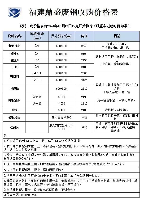 大东海废钢采购价格调整.统一跌**元/吨、****年**月**日上午**点开始执行,精品****、优质****、重废一****、重废二****、中废****、剪切废料****、纯钢筋头**-**厘****、纯钢筋头**厘以上****、红冲马蹄铁****、冲豆****-****.钢筋切粒****、压扁管****、冲板小压块****、*米*钢筋压块****、*米*钢筋压块****、矽(硅)钢片****(爆炸物、密封件、掺假等、按公司规定给予重罚,带油质、长乱、装袋类废钢拒收!)