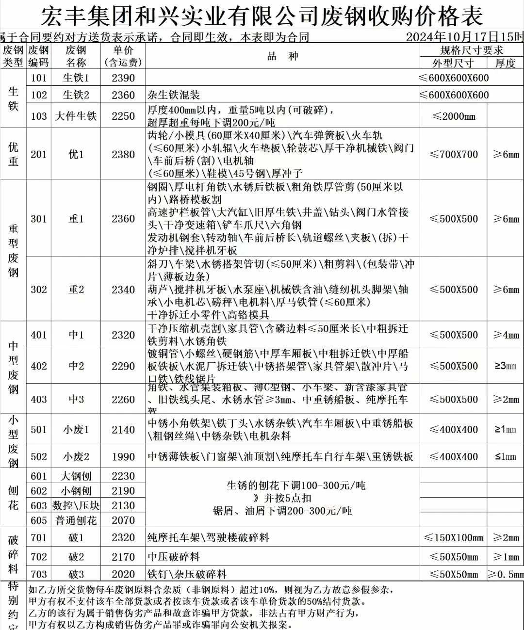 顺昌宏丰通知,废钢刨花破碎料等所有品种统一下调**元/吨,生铁****-****、大件生铁****、优重****、重废****-****、中废****-****、小废****-****、大钢刨****、数控/压块****、普刨****、破碎料****-****