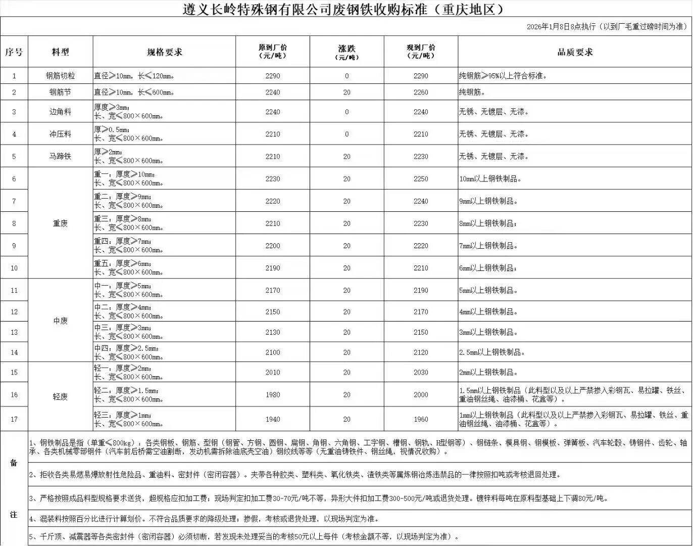 重庆永航钢铁集团今日(*月*日),所有废钢价格上调**,一.(*一*)